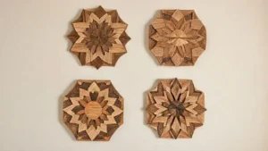 Utilizar formas geométricas para estruturar seu mural pode criar um efeito visual intrigante. Triângulos, retângulos e hexágonos combinados em diferentes tonalidades e texturas de madeira criam uma sensação de movimento.