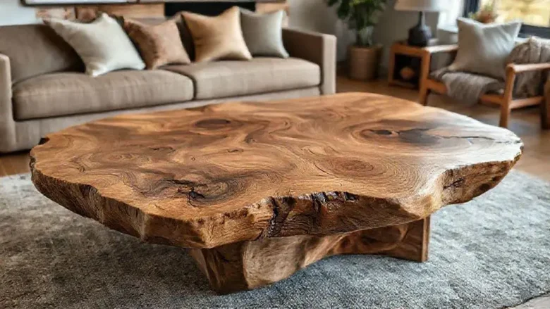 Mesas de centro com tampo irregular feitas de peças únicas de madeira de demolição são a tendência que traz personalidade e autenticidade aos ambientes.